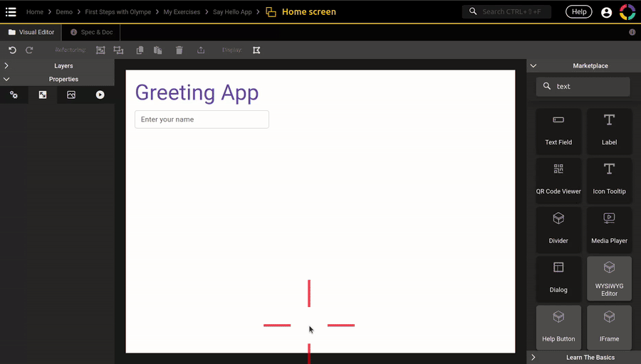For our Say Hello App we need to get the user's name. To get this kind of information one very powerful component is TextField. This component shows a field where the user can typ text. It can do much more than that, but for now we will limit ourself to text only since we need a name. However do not hesitate to play with it 🔧