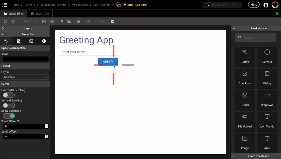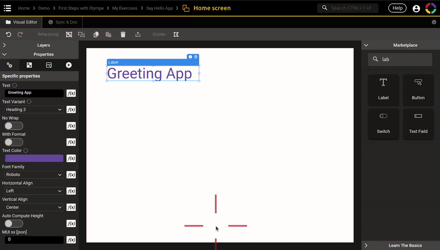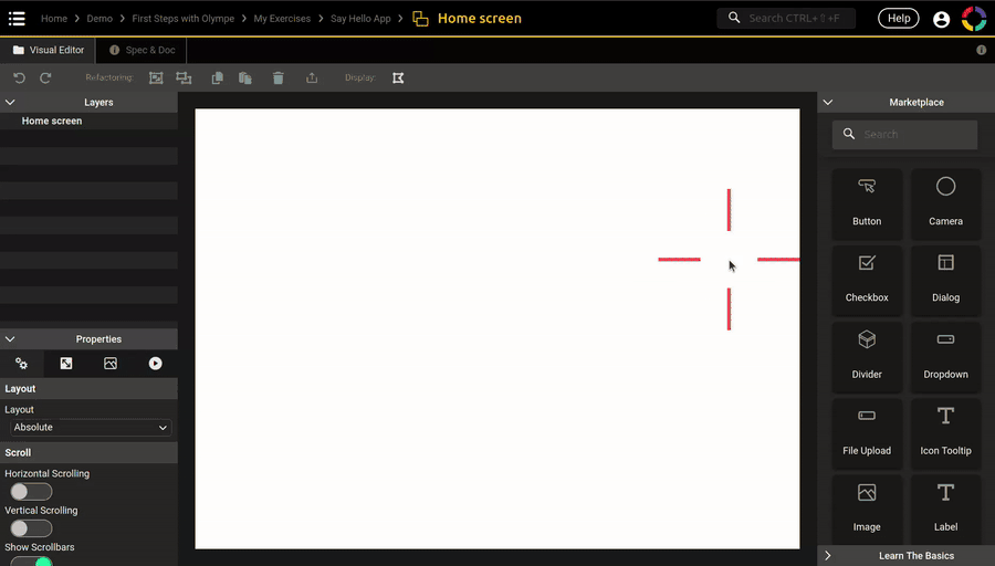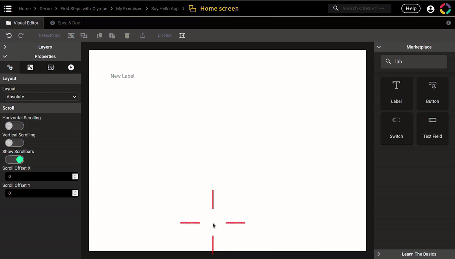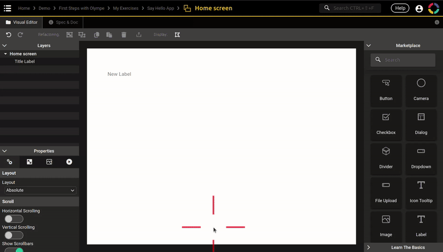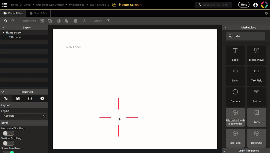 Notice also the blue frame around the Label, it tells us that the Label is currently selected. You can select a component by clicking on it in the main area or in the Layers panel. On the contrary if you click anywhere else, it will select the Home screen directly. This gif shows those two methods: