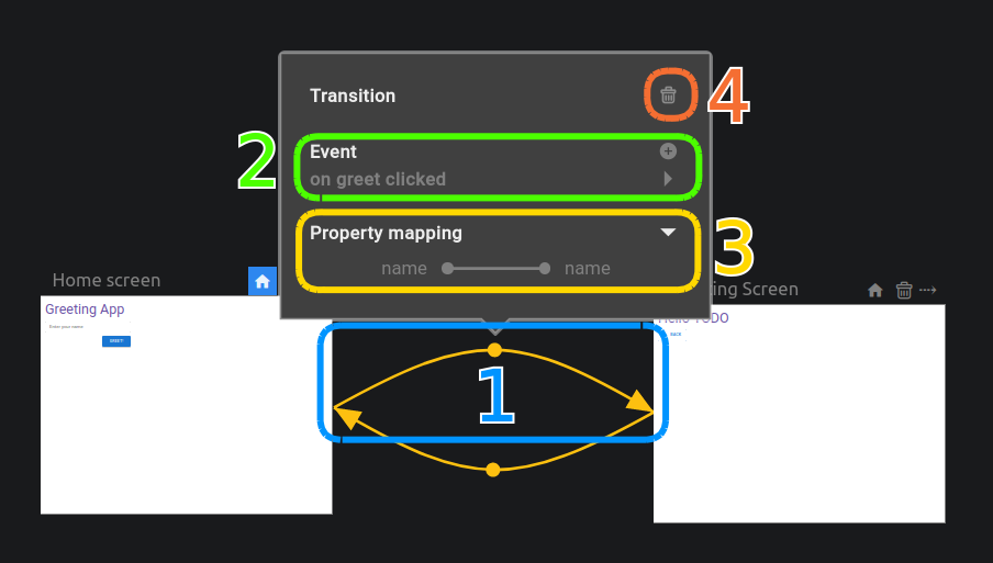 To refresh our memory a little, the 3 button in this image allows us to create transitions between screens. That's exactly what we want 😉