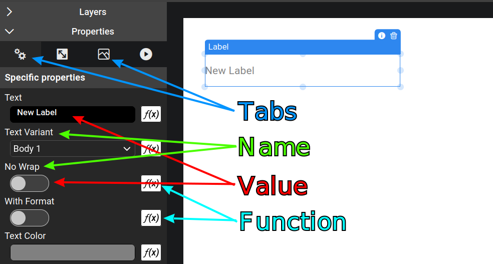 1. Specific properties: those are the properties specific to the component itself, in our case all label-related properties are in this tab.