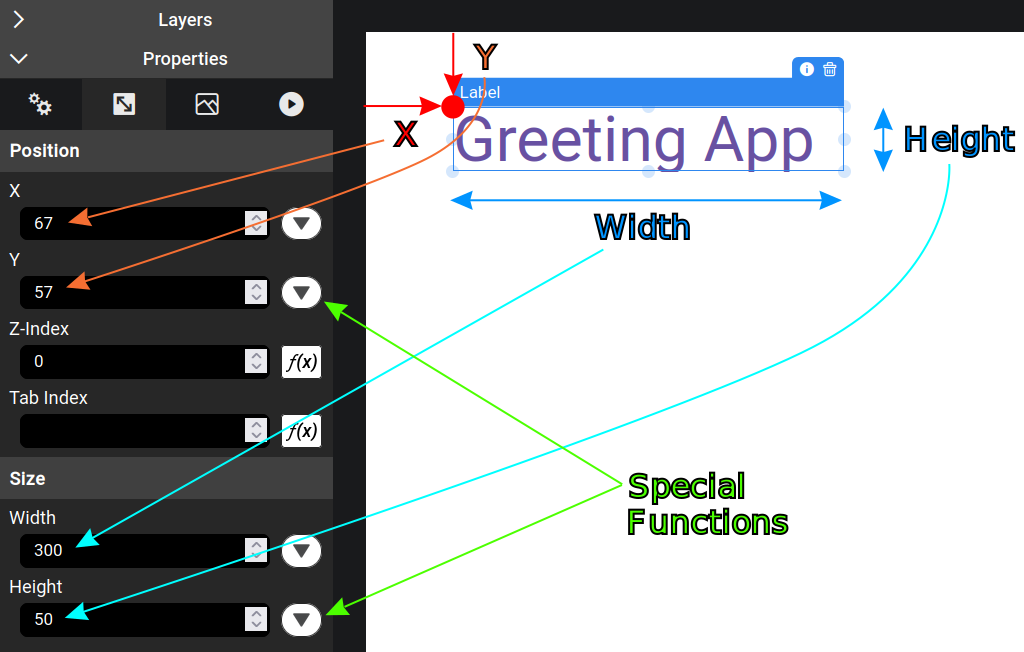 There are two ways of changing those values. You can move and resize the component directly in the main area of the Visual Tab, this is useful for quick prototyping and to test things out. Or you can set the value manually directly from the Properties panel, to be more precise:
