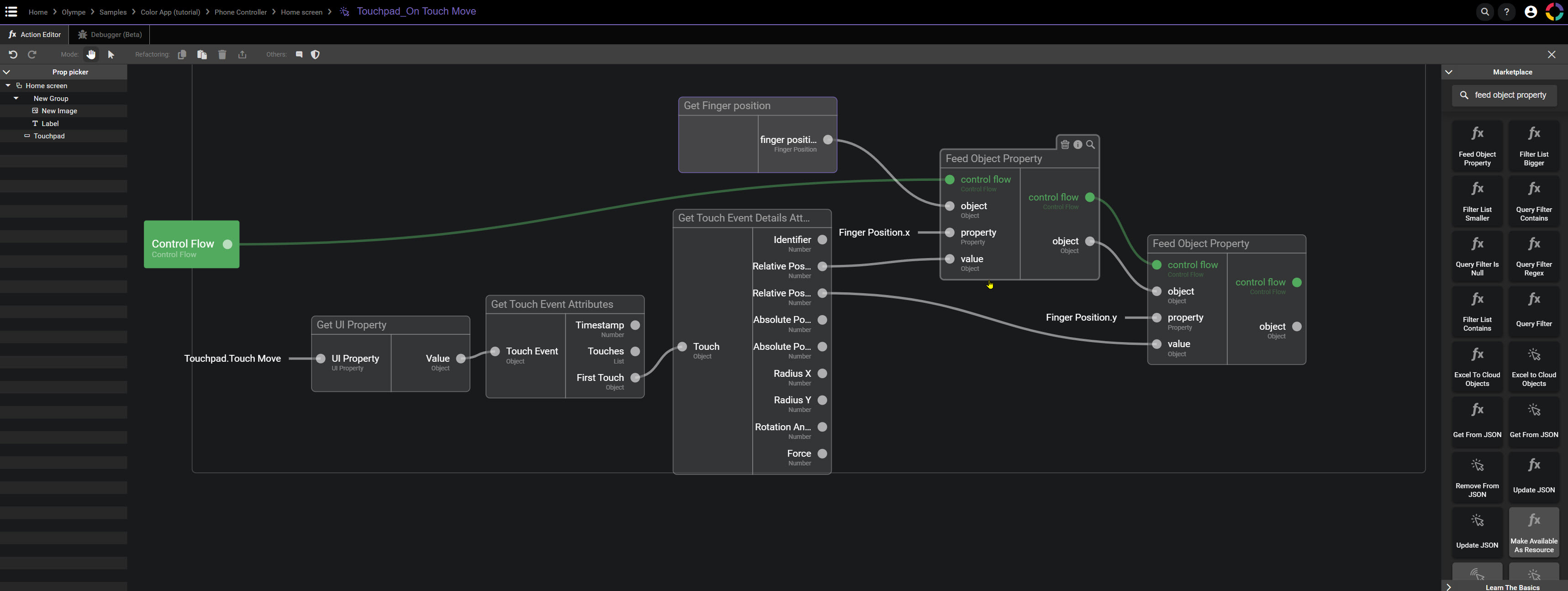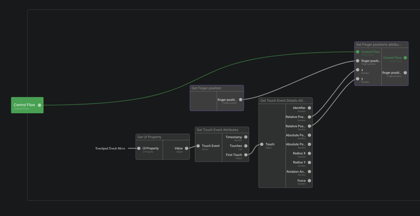 To improve performance, replace the setter ( Set Finger Position's attributes ) we created earlier with two Feed Object Property bricks as follows: